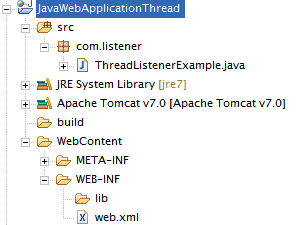 <?xml version="1.0" encoding="UTF-8"?> <web-app xmlns:xsi="http://www.w3.org/2001/XMLSchema-instance" xmlns="http://java.sun.com/xml/ns/javaee" xmlns:web="http://java.sun.com/xml/ns/javaee/web-app_2_5.xsd" xsi:schemaLocation="http://java.sun.com/xml/ns/javaee http://java.sun.com/xml/ns/javaee/web-app_2_5.xsd" version="2.5"> <listener> <listener-class>com.listener.ThreadListenerExample</listener-class> </listener> </web-app>